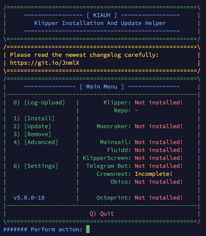sudo rm -Rf kiauh* KlipperScreen/ .kiauh.ini printer_data/ crowsnest - Install kiauh :